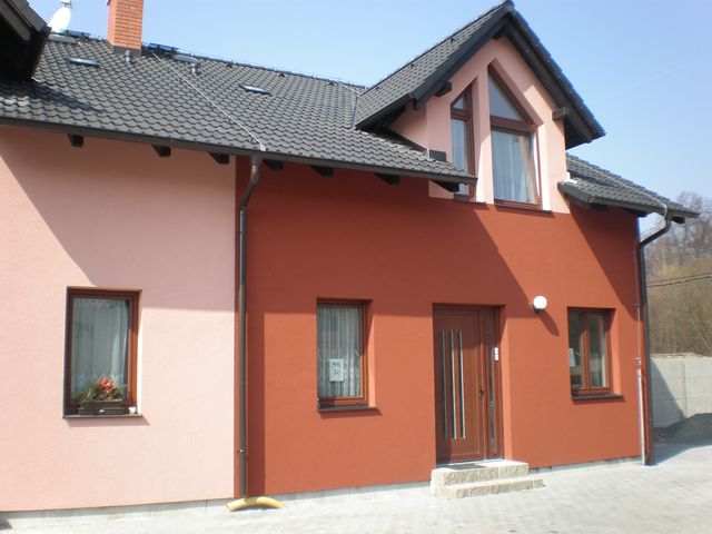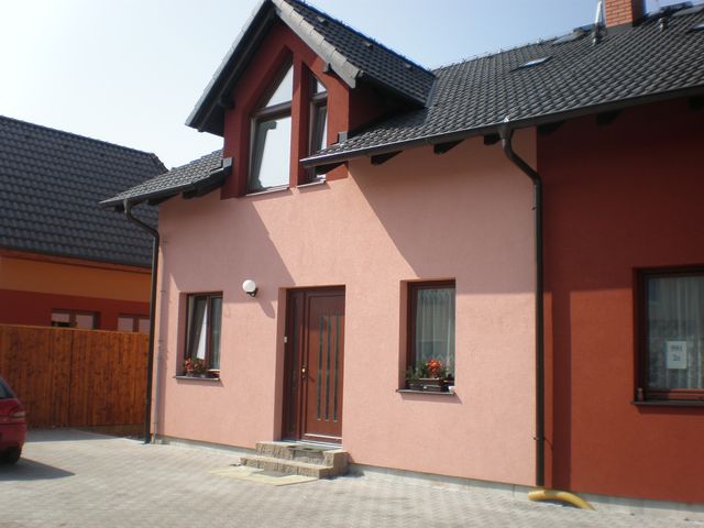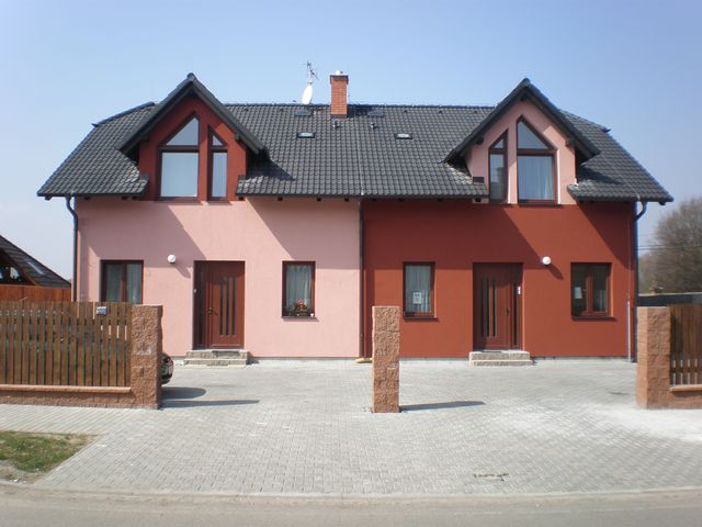 Rodinný dvojdům jsme postavili v průběhu roku 2010. V přízemí levého domu je byt dispozičně řešený jako 2+KK, v patře pak byt 3+KK. V pravém domě jsou v přízemí komerční prostory (2 oddělené kanceláře) a v patře byt 3+KK.